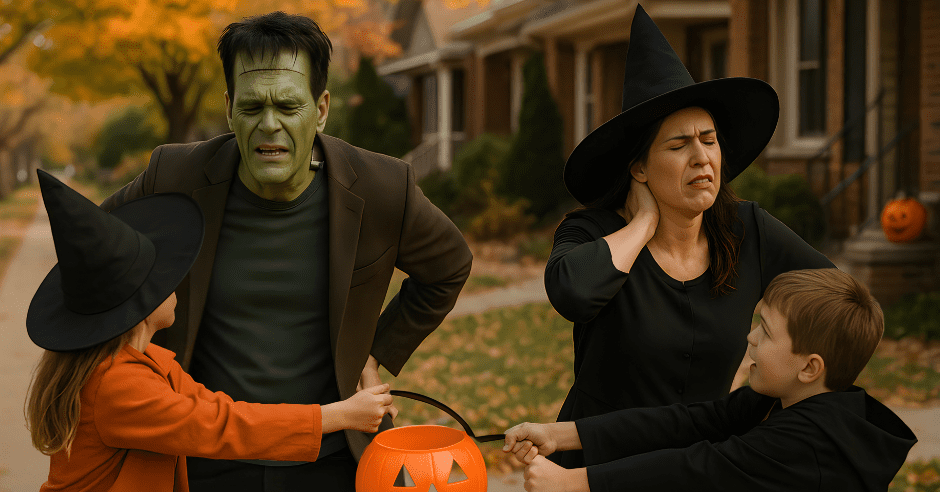 As the season of pumpkins, costumes, and spooky tales approaches, families everywhere are gearing up for trick-or-treating, decorating, and neighborhood adventures. But for many parents, what should be a fun-filled night can quickly turn into a real-life horror story — aching backs, stiff necks, and sore muscles from all the bending, lifting, and walking that Halloween brings.
